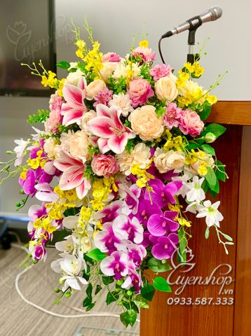 Lãng hoa dành cho Bục Phát Biểu với hoa chủ đạo là hoa Lan, hoa Ly với chất liệu cao su cao cấp.