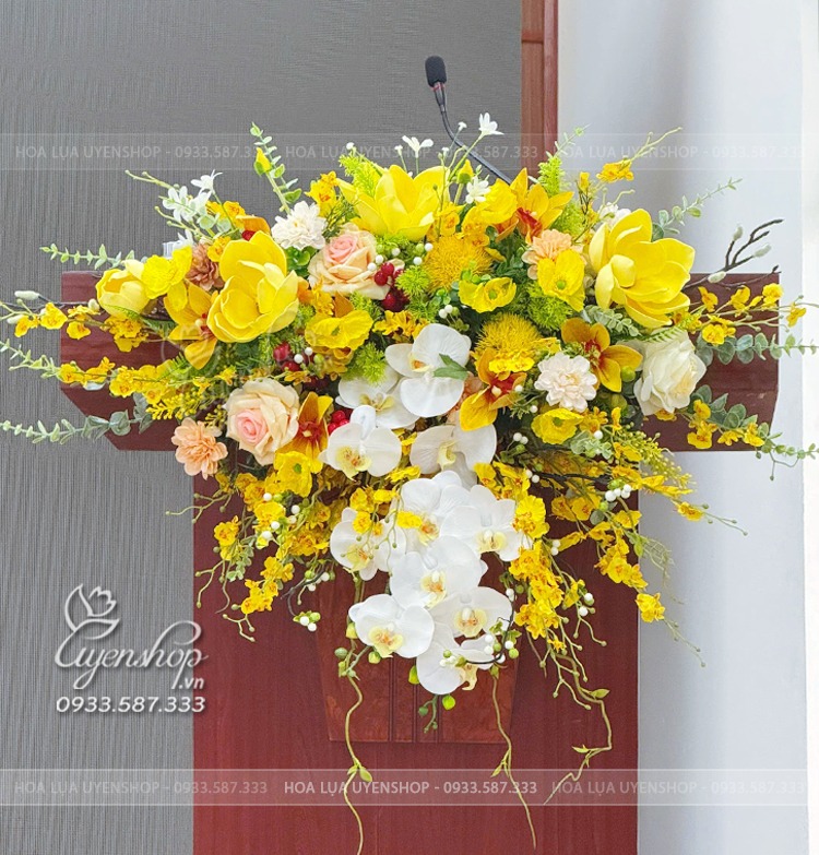 Mẫu hoa bục phát biểu thiết kế kết tone Vàng chủ tạo pha chút sắc đỏ tạo nên một tổng thể hài hòa mang nét tươi sáng, sang trọng.