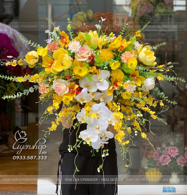 Shop thiết kế lãng hoa theo dáng treo bục có thể di duyển dễ dàng, phù hợp sử dụng trang trí các phòng họp, hội nghị có không gian trang trí theo tone màu sáng.