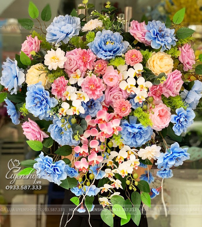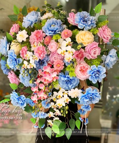 Hoa giả, Hoa lụa đẹp, LÃNG HOA BỤC PHÁT BIỂU TONE XANH