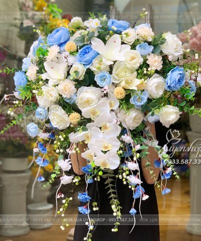 Mẫu hoa bục phát biểu thiết kế kết tone xanh chủ tạo pha chút tone trắng nhẹ nhàng tạo nên một tổng thể hài hòa mang nét tươi sáng, sang trọng.