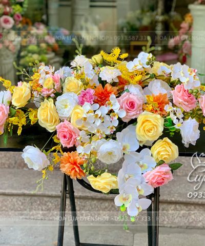 Shop thiết kế lãng hoa theo dáng để trên mặt bục có thể di duyển dễ dàng, phù hợp sử dụng trang trí các phòng họp, hội nghị có không gian trang trí theo tone màu sáng.