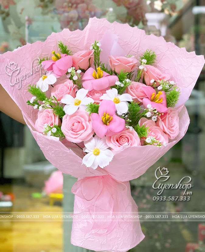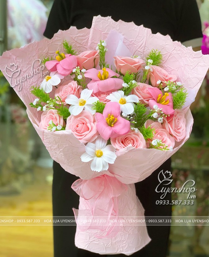 Hoa giả, Hoa lụa đẹp, BÓ HOA SÁP TONE HỒNG