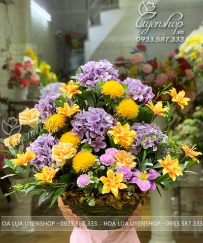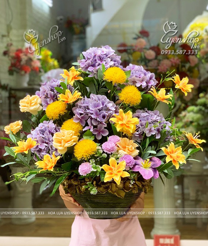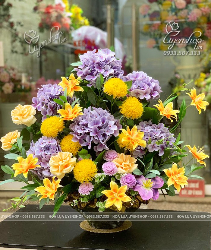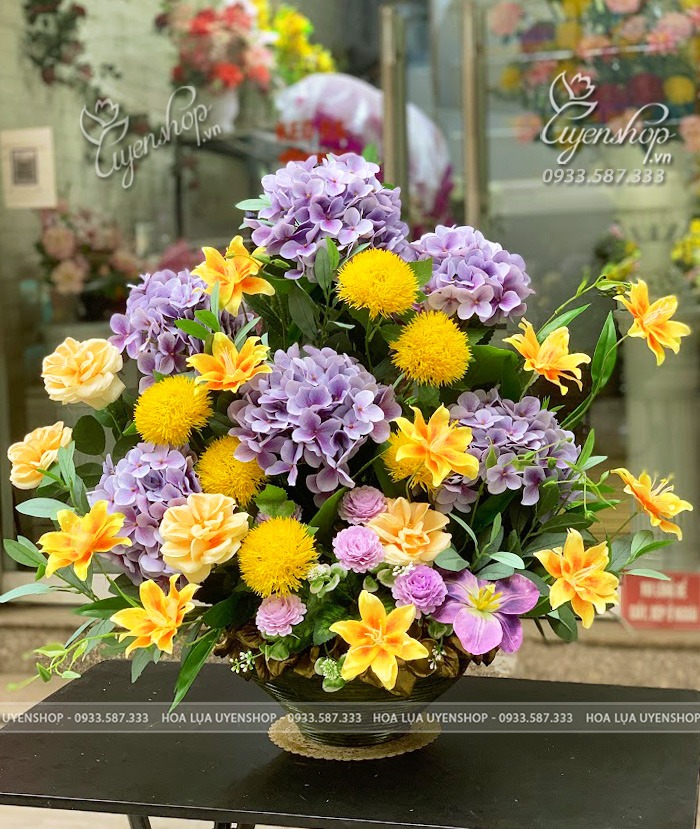 Sự kết hợp nổi bật giữa sắc tím nhẹ nhàng của cẩm tú cầu cùng vàng tươi rực rỡ tạo nên tổng thể hài hòa, cuốn hút và đầy sức sống. Thiết kế dáng tròn sum vầy giúp không gian thêm sang trọng, ấm áp và nổi bật.
