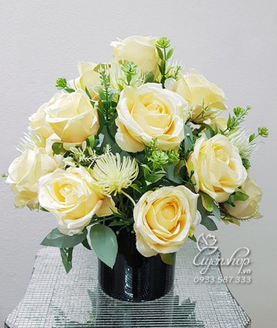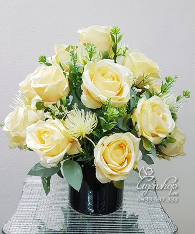 Bình Hoa Hồng màu Kem nhẹ nhàng phù hợp cho bạn đặt trên bàn trà, bàn cafe hay bàn làm việc, có thể trang trí trên kệ tivi…