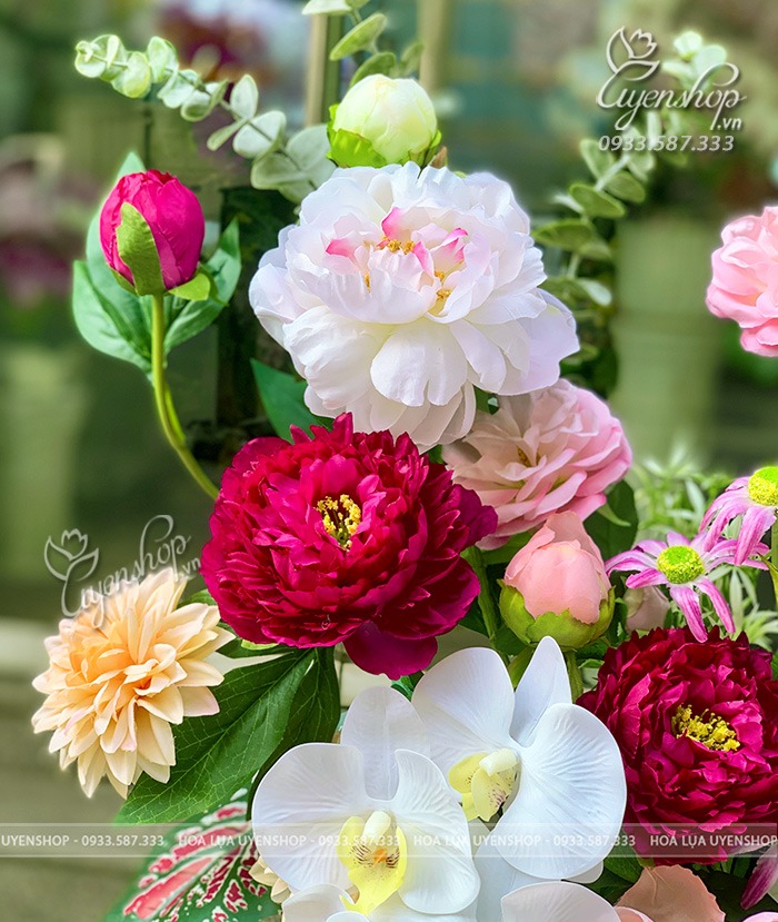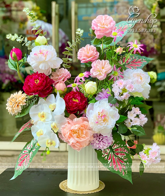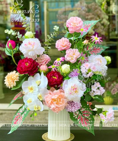 Bình hoa mẫu đơn tone hồng mang vẻ đẹp sang trọng và đầy cuốn hút. Hoa mẫu đơn được xem là biểu tượng của phú quý, tài lộc và hạnh phúc viên mãn trong phong thủy, giúp thu hút may mắn và vượng khí cho gia chủ.