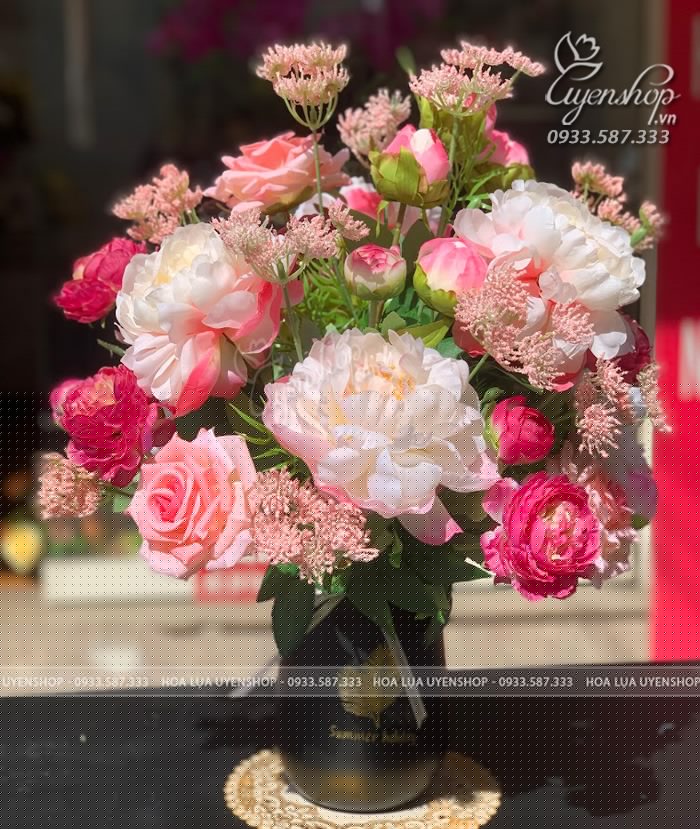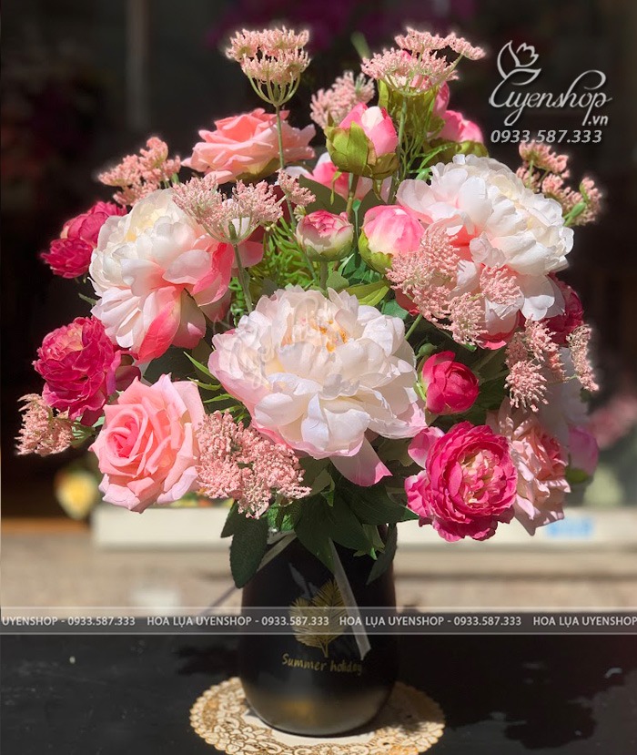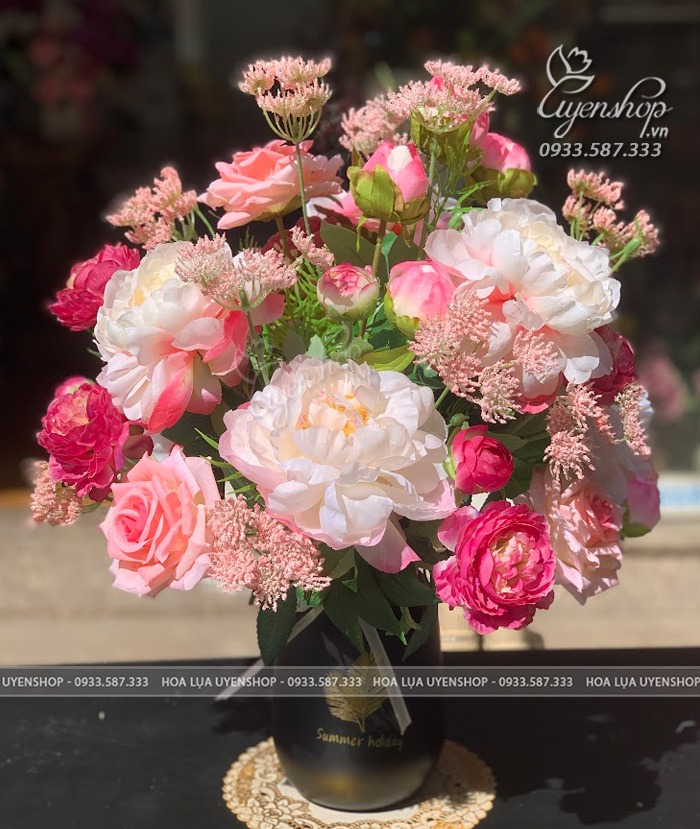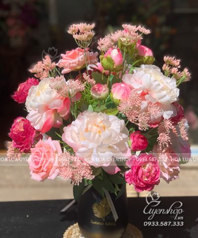 Bình hoa Mẫu đơn mix tone hồng nhẹ nhàng xinh iu, sang trọng mà cũng không kém phần nổi bật.