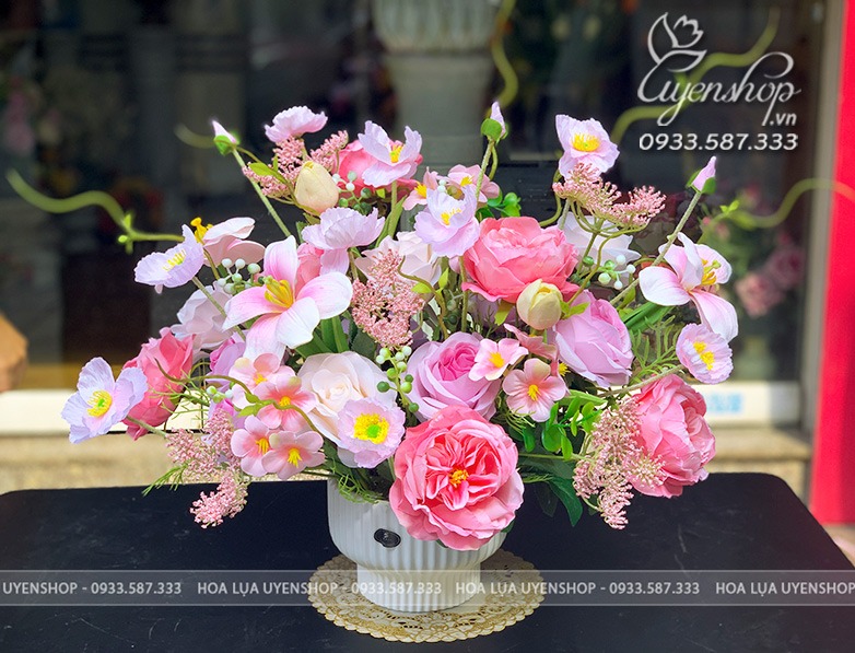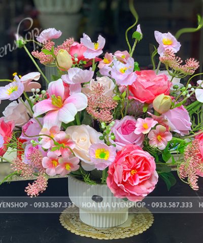 Mỗi bình hoa được Hoa lụa Uyên Shop thiết kế tỉ mỉ với gam màu nhẹ nhàng, cách phối lá – hoa – cành tự nhiên như thật.
