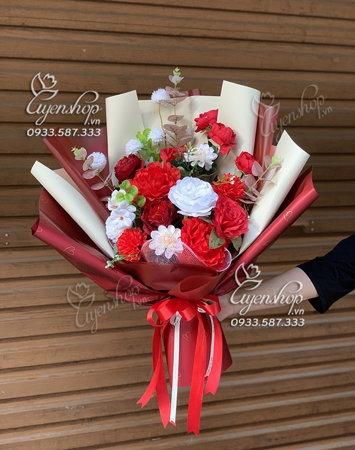 Hoa giả, Hoa lụa đẹp, BÓ HOA LỤA TONE ĐỎ