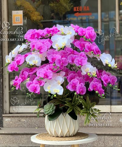 Chậu Lan được kết hợp với tông màu trắng-tím sang trọng, hoa cao su cao cấp, thích hợp đặt ở phòng khách, khách sạn…làm quà tặng tân gia hay tặng sếp rất ý nghĩa.