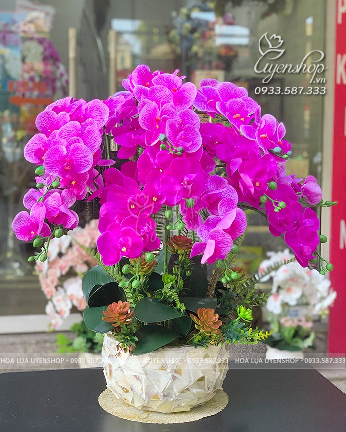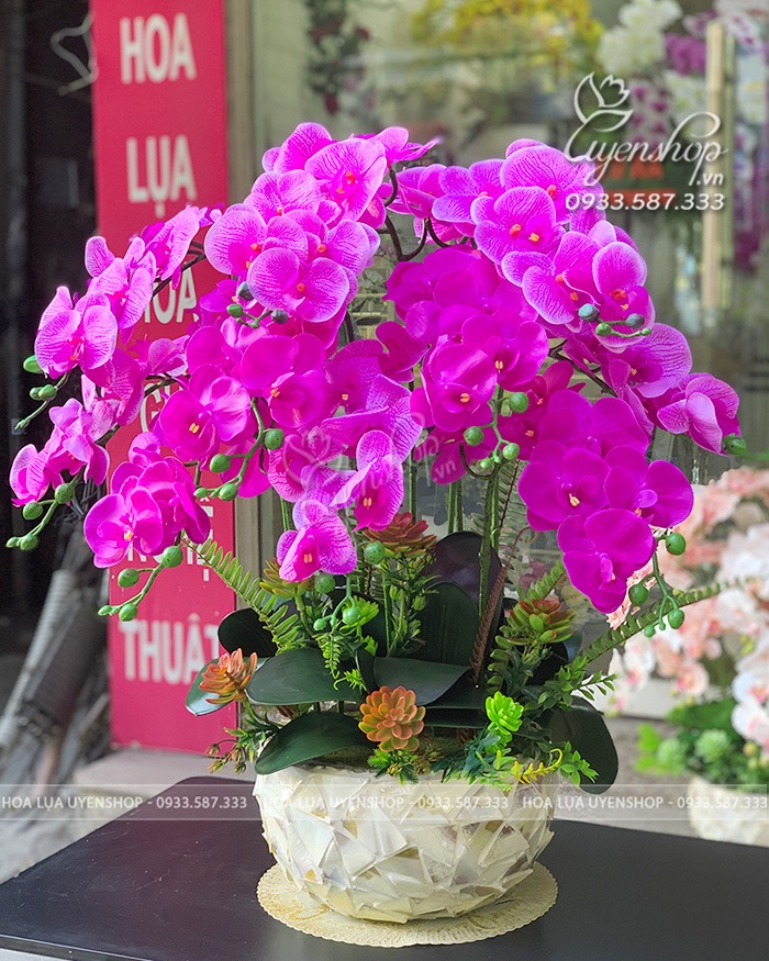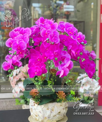 Chậu lan hồ điệp cao su cao cấp là sản phẩm trang trí tinh tế, kết hợp giữa vẻ đẹp tự nhiên của hoa lan và chất liệu cao su mềm mại, bền bỉ. Hoa được mô phỏng giống như hoa thật, mang đến sự sang trọng, tinh tế cho không gian sống hoặc làm việc.