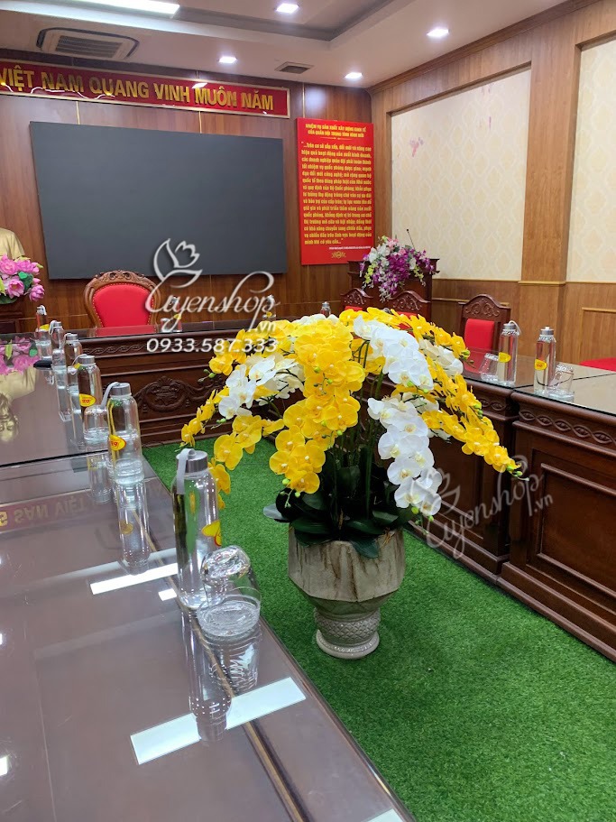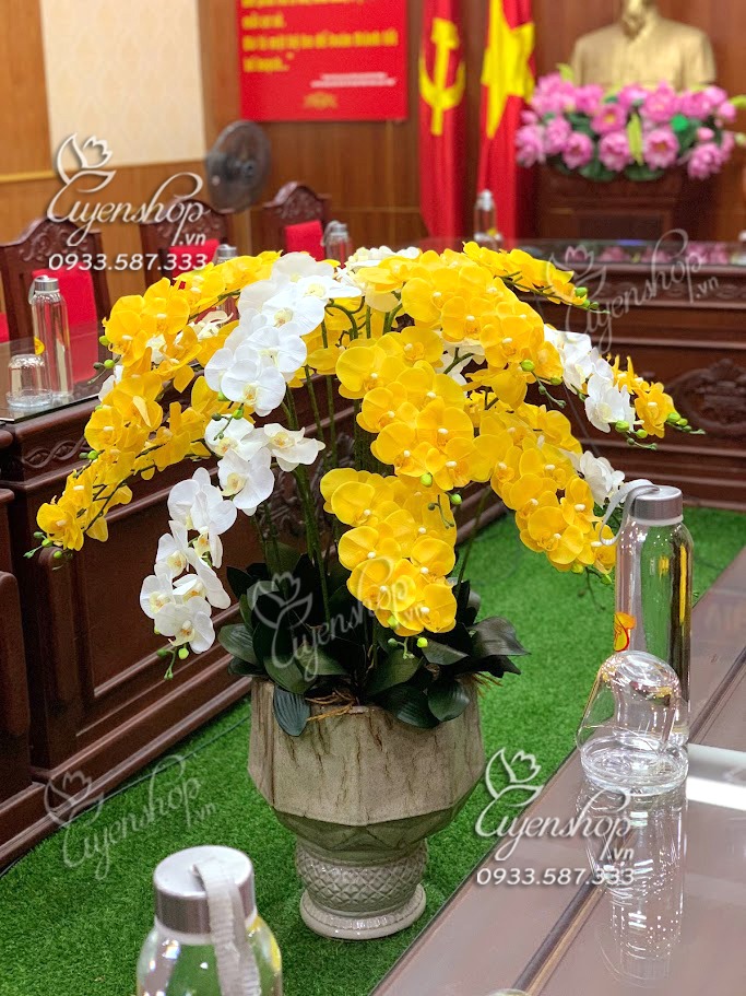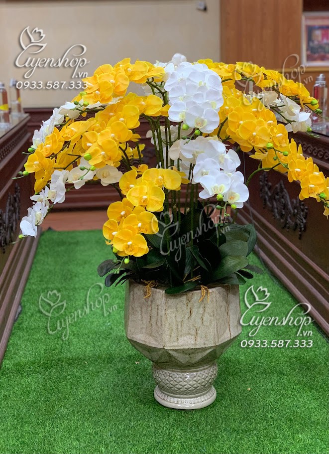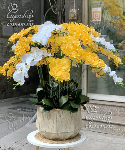 Chậu Lan vàng mix trắng trang trí phòng khách với chất liệu cao su cao cấp đẹp y như hoa thật, thích hợp cho bạn trang trí phòng khách lớn, làm quà tặng tân gia hay trang trí văn phòng rất đẹp.