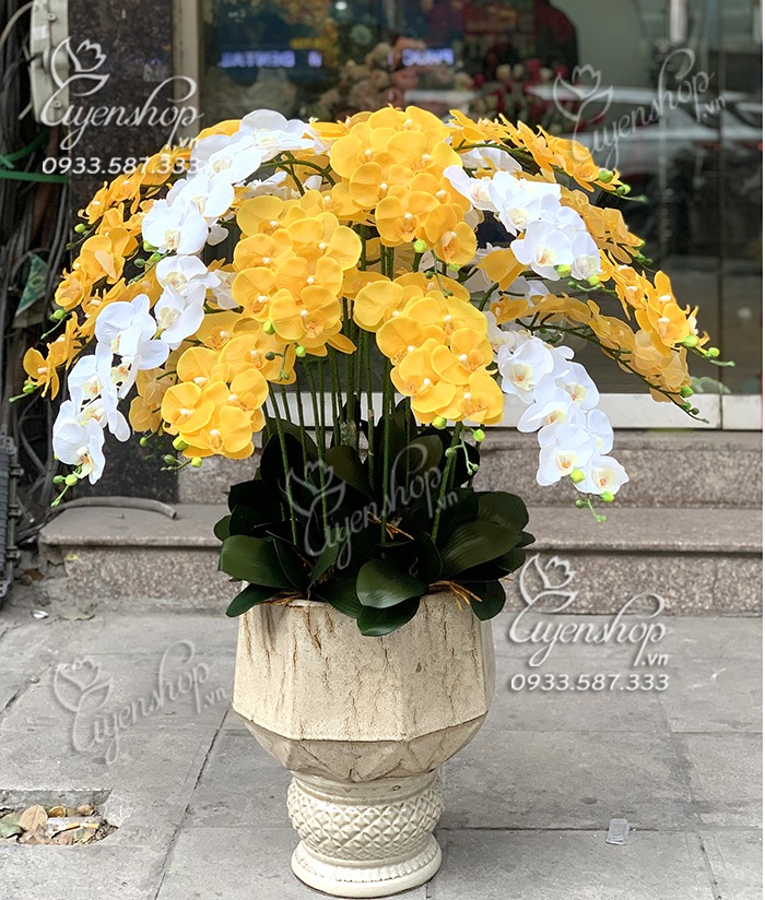 Hoa giả, Hoa lụa đẹp, CHẬU LAN HỒ ĐIỆP TONE VÀNG – TRẮNG