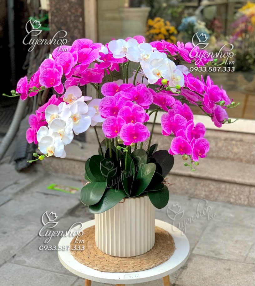 Chậu Lan được kết hợp với tông màu trắng-tím sang trọng, được cắm tròn đều các mặt trông rất tự nhiên, hoa cao su cao cấp, thích hợp đặt ở phòng khách, khách sạn…làm quà tặng tân gia hay tặng sếp rất ý nghĩa. Hoa được cắm theo dải màu từ đậm đến nhạt.