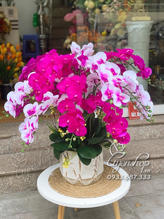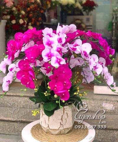 Chậu Lan được mix màu tím đậm nhạt hài hòa, được cắm tròn đều các mặt trông rất tự nhiên, hoa cao su cao cấp, thích hợp đặt ở phòng khách, khách sạn…làm quà tặng tân gia hay tặng sếp rất ý nghĩa. Hoa được cắm theo dải màu từ đậm đến nhạt.