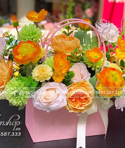 Một giỏ hoa lụa tone cam đặt trong phòng khách, bàn làm việc hay không gian lễ tân sẽ giúp khơi dậy tinh thần tích cực và tạo điểm nhấn sang trọng cho không gian.