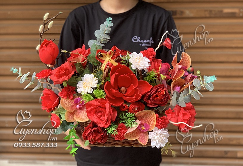 Giỏ hoa cao 33cm, xòe rộng 45-50cm.
