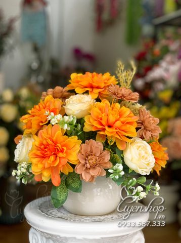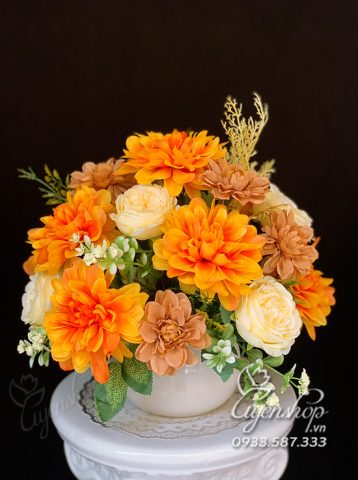 Sự kết hợp hài hòa giữa tone màu vàng cam- nâu tây của hoa Thược Dược cùng hoa Trà david này thực sự là điểm nhấn cho bất cứ không gian nào nếu được bày trí.