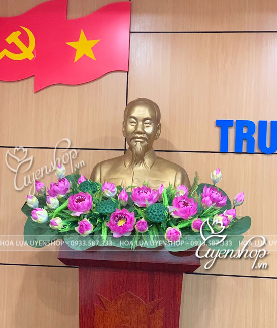 Hoa Sen Trang Trí Tượng Bác với những bông sen Cao Cấp được nghệ nhân nổi tiếng làm thủ công từng cánh hoa, kết hợp với những nụ, đài, lá mang lại bục hoa Sen trang trí tượng Bác sang trọng, tự nhiên.