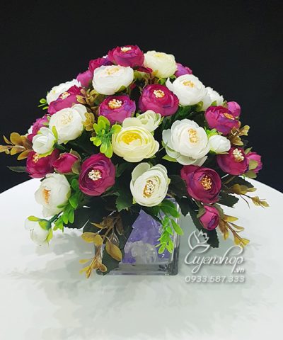 Bình hoa cao 25cm, rộng 20cm, được cắm vào lọ thủy tinh thả đá xinh xắn, đáng yêu.
