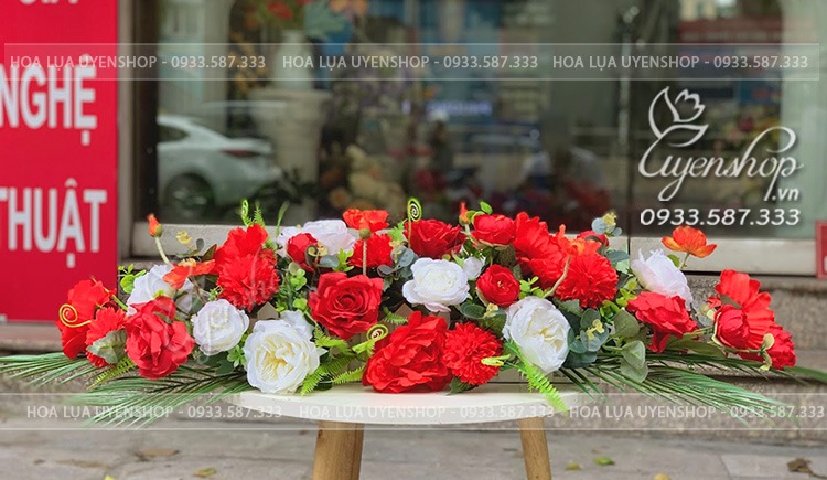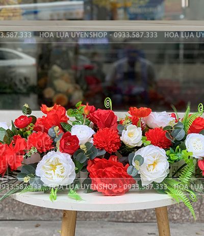 Lãng hoa bàn họp với tone màu đỏ nổi bật mà vẫn sang trọng. Một lãng hoa xinh xắn với sự kết hợp khéo léo giữa hoa hồng, mãu đơn,…sẽ là một điểm nhấn cho văn phòng hay sự kiện của các buổi meeting,…