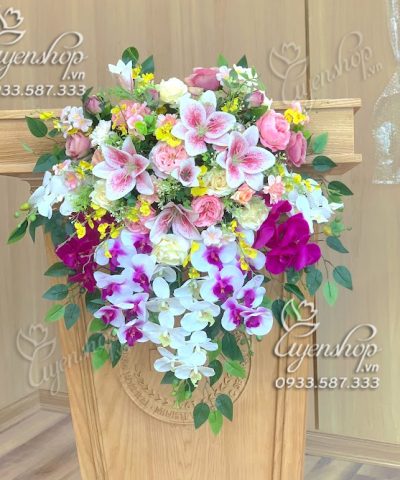 Lãng hoa dành cho Bục Phát Biểu với hoa chủ đạo là hoa Lan, hoa Ly với chất liệu cao su cao cấp.