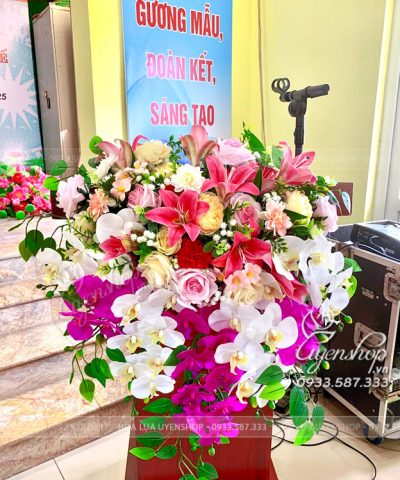Lãng hoa dành cho Bục Phát Biểu với hoa chủ đạo là hoa Lan, hoa Ly với chất liệu cao su cao cấp.