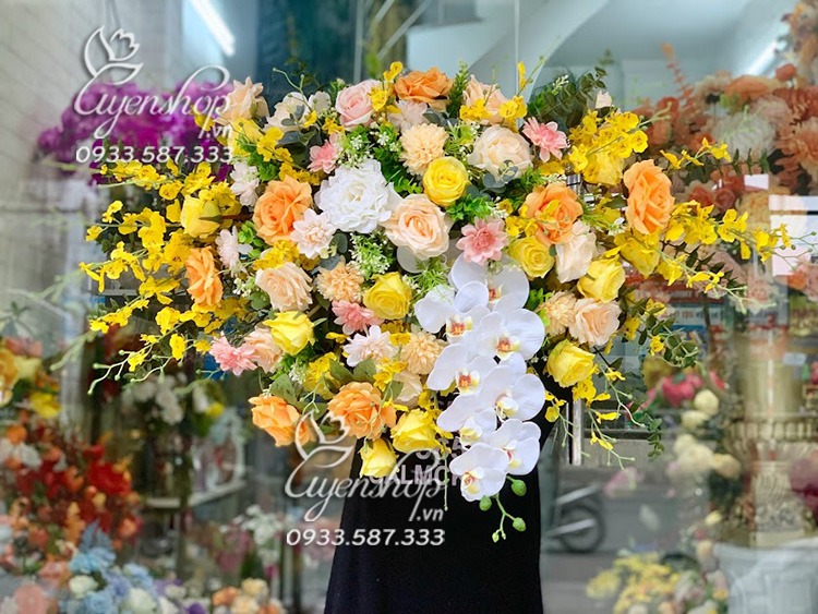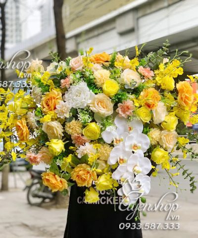 Mẫu hoa để bục phát biểu với tone màu vàng-trắng chủ đạo, mang đến vẻ đẹp rực rỡ và sang trọng, shop làm theo dáng treo nên có thể di chuyển dễ dàng, không làm che mặt người phát biểu. Dành cho cơ quan hay có sự kiện, trang trí lâu bền và phòng họp lúc nào cũng đẹp.