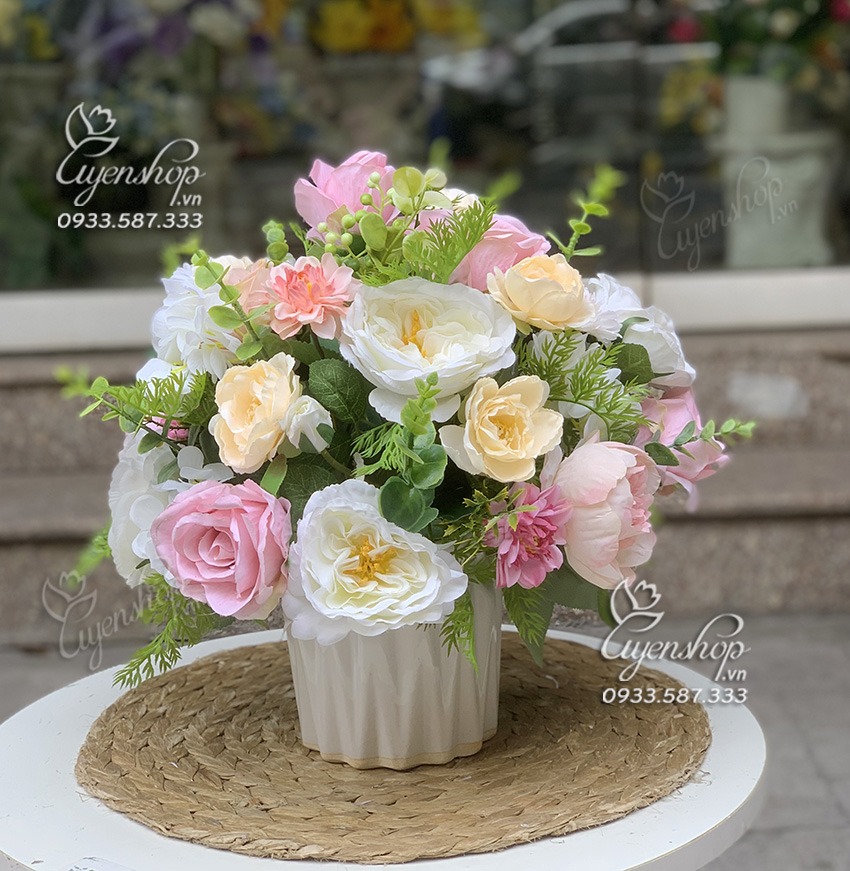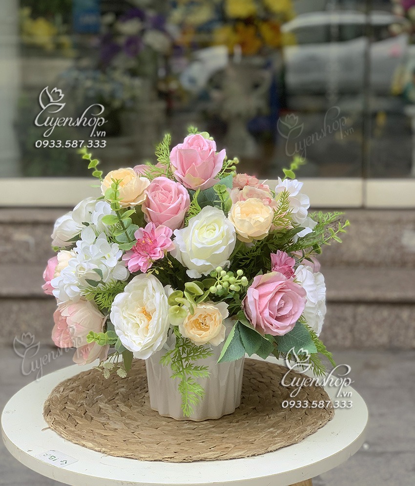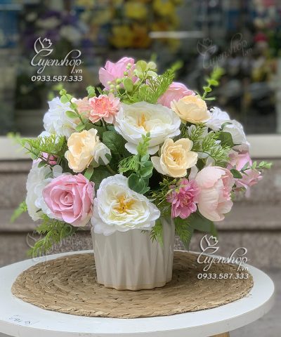Bình hoa để bàn với tone hồng trắng nhẹ nhàng, màu sắc trang nhã, màu của sự yêu thương và trẻ trung. Bình hoa mang nét mềm mại và tươi mới cho căn phòng, bạn có tặng người thân, bạn bè nhân ngày sinh nhật hay ngày lễ, cũng có thể trang trí tại bàn ăn, bàn trà hay bàn làm việc…