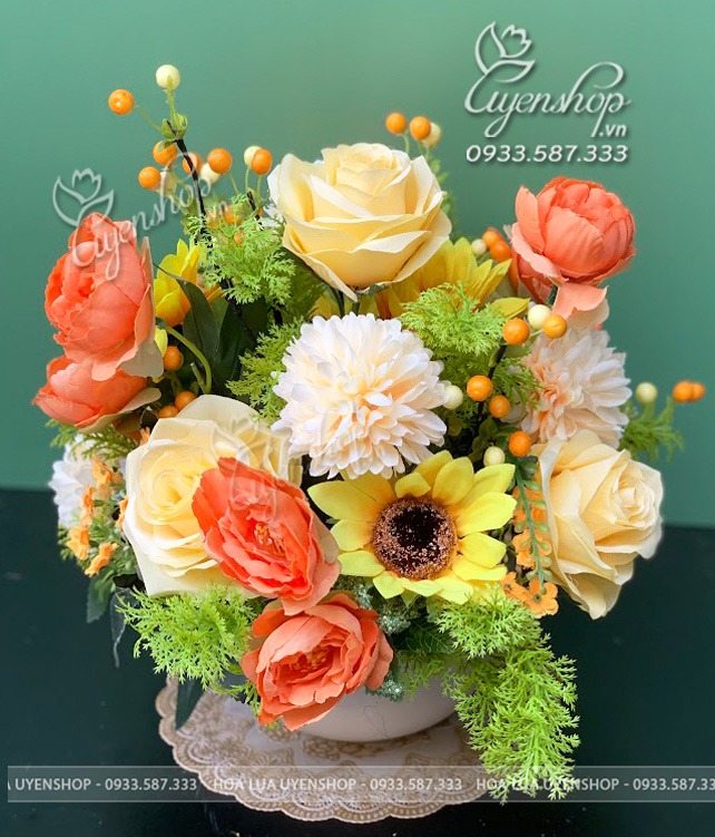 Kích thước: Bình hoa và hoa có kích thước cao 30cm, xòe rộng 25cm.
