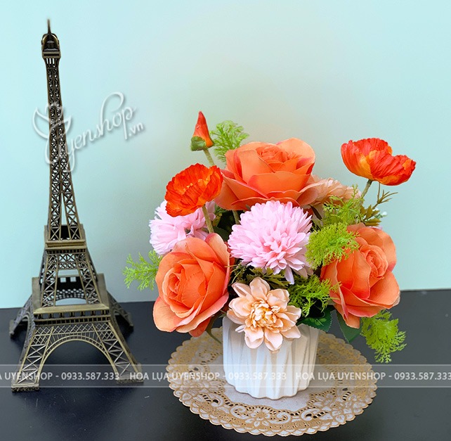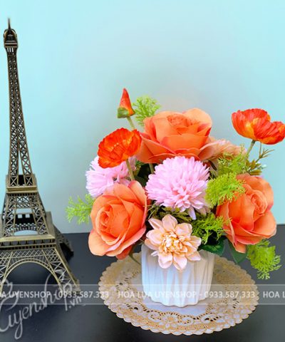 Hoa giả, Hoa lụa đẹp, LỌ HOA NHỎ TONE CAM