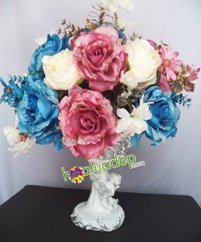 Bình hoa mang phong cách Châu Âu với những bông hoa lấp lánh kim tuyến. Một vẻ đẹp cổ điển, sang trọng. Cắm với bình hoa dáng Thiên thần cho ngôi nhà thêm sinh động. Bình hoa được cắm tròn.