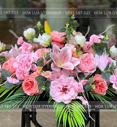 Lãng hoa đặt bàn họp với tone hoa màu hồng chủ đạo kết hợp với một chút màu trắng và điểm lá xanh tạo nên một tổng thể vô cùng nhẹ nhàng, tươi sáng cho cả gian phòng. Phòng sẽ trở nên trang trọng, và tinh tế hơn nếu như được trang trí thêm bằng những lãng hoa đặt bàn phù hợp.