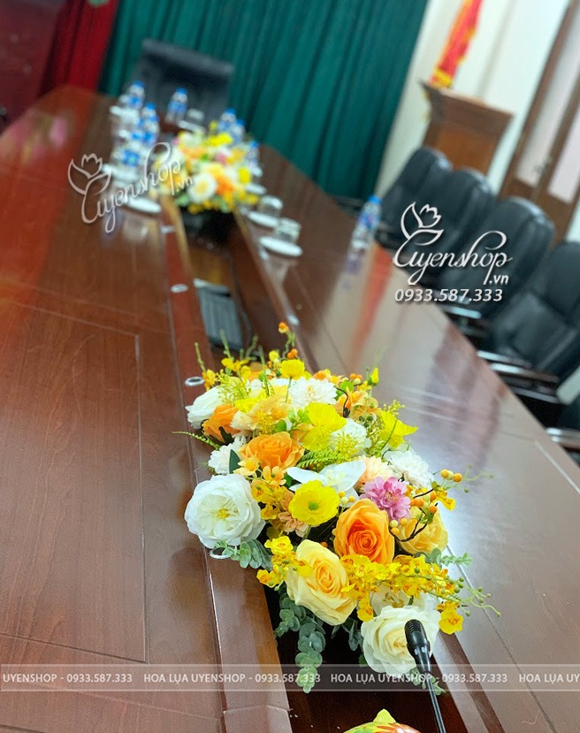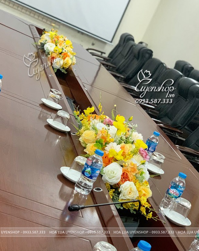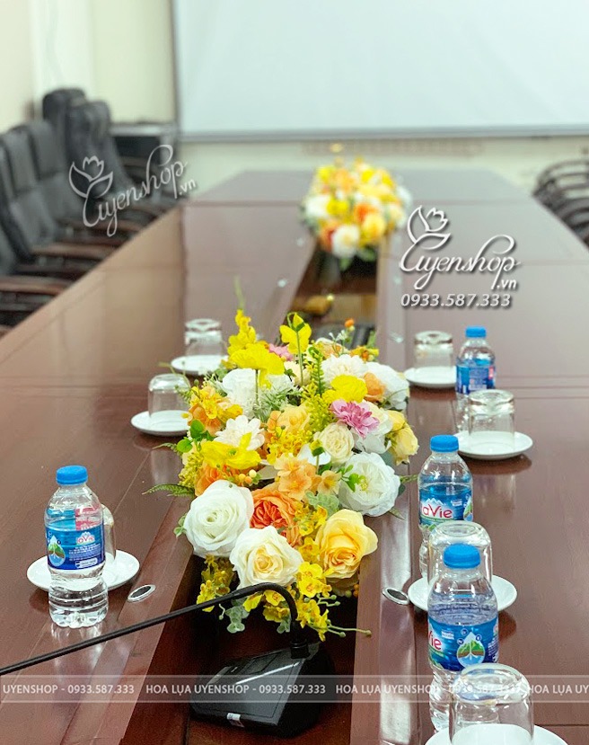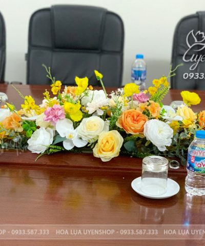 Thiết kế lẵng hoa được kết hợp hài hòa giữa các loại hoa lụa cao cấp với gam vàng chủ đạo, tạo nên tổng thể tinh tế nhưng vẫn đủ nổi bật để làm điểm nhấn trên bàn họp. Kiểu dáng gọn gàng, cân đối giúp không che tầm nhìn, phù hợp cho các cuộc họp, hội nghị hoặc sự kiện quan trọng.